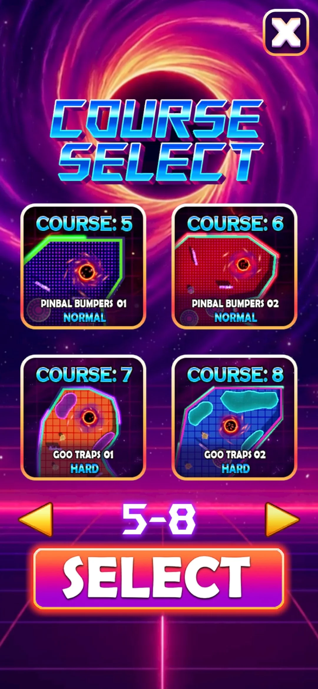 With 12 unique courses and 9 holes in each course, Gravity Golf gives you 108 handcrafted holes packed with color, variety, and challenge. Every course has its own visual energy, gameplay flavor, and obstacle combinations, so the experience keeps feeling fresh as you play. Some holes are clean and satisfying. Others demand timing, precision, creative bank shots, and nerves of steel.